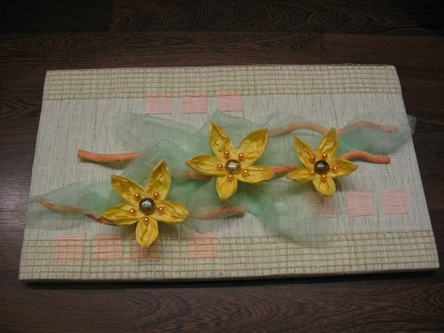 Теперь приклеиваем цветочки. Между ними укладываем органзу, горизонтально приклеила ленту-сетку в тон.