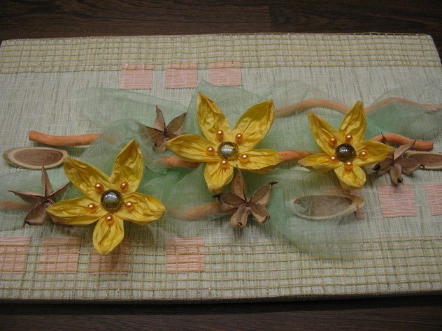 Вот так делаю цветочки. На данной фотографии показано три стадии изготовления. Сначала ленту разворачиваю, потом склеиваю концы в виде лепестков, а далее склеиваю лепестки в цветок.