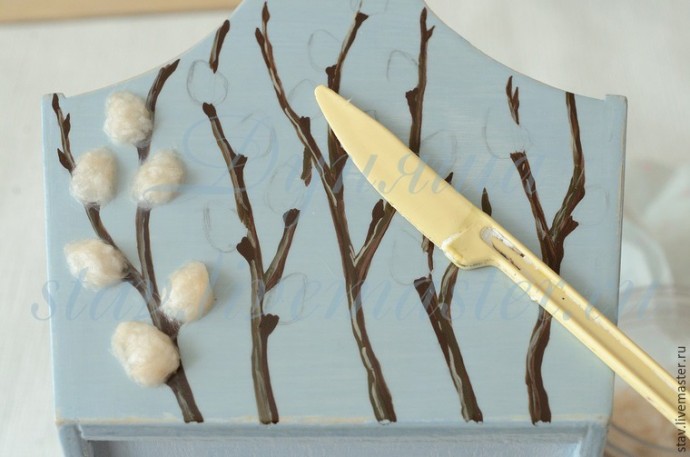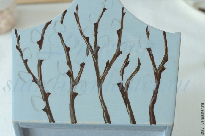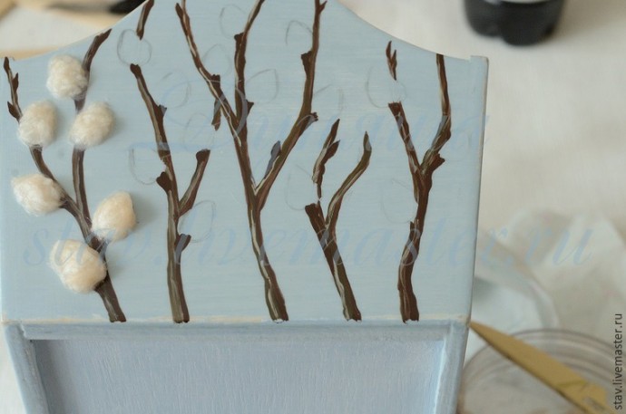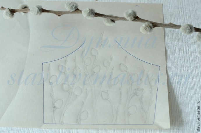 Обведем, чтобы хорошо видеть границы, нарисуем в произвольном порядке несколько веточек вербы.