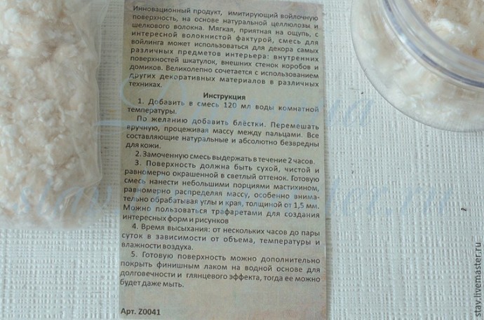 Однажды я использовала его, когда делала магнитики-овечек к новому году. Очень простой в использовании материал и очень похож по моим ощущениям на жидкие обои. В инструкции написано, что весь объем коробочки нужно залить 120 мл воды комнатной температуры.