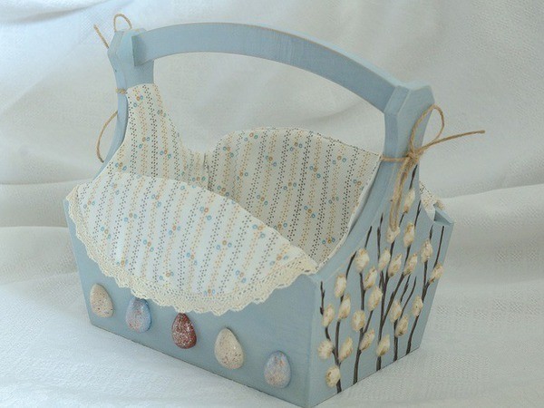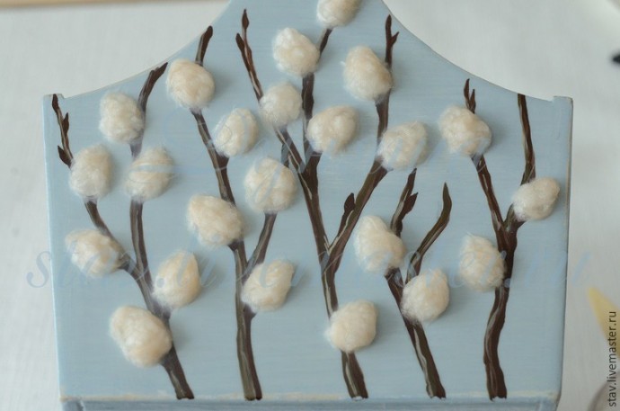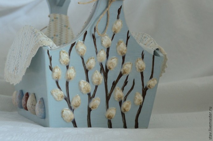 Заполняю все очерченные пуховки, оставляю сохнуть. У меня сохло долго — двое суток. Таким же образом декорируем вторую боковину корзинки и опять сушим.