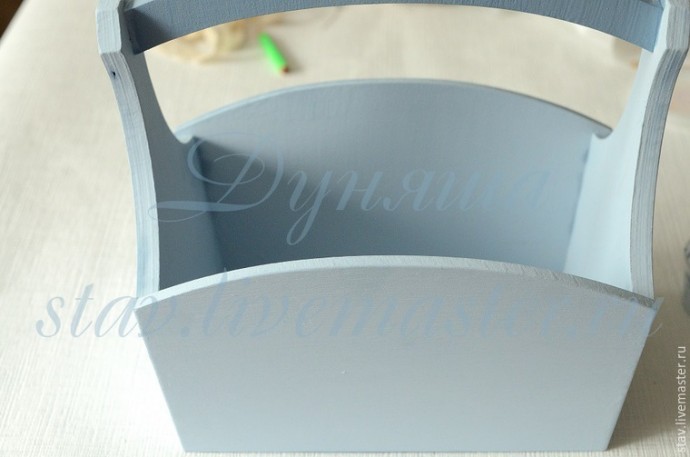 Получаю вот такой голубой цвет. Покрываю корзинку в два слоя снаружи и изнутри.