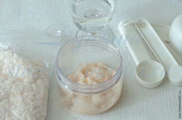 Я выкладываю приблизительно четверть и заливаю 30 мл воды. Воду отмеряю при помощи икеевских емкостей.
