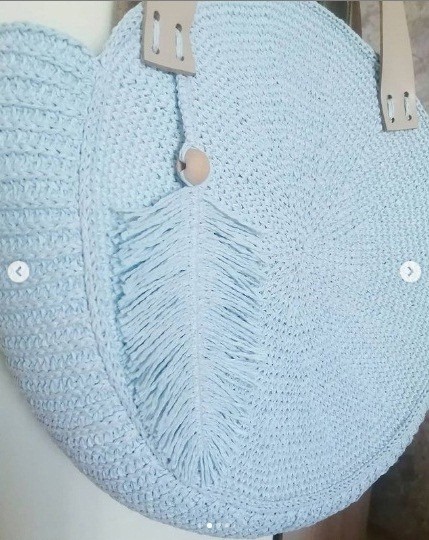 Боковинка: Набираем цепочку из 25 воздушных петель. 1 ряд. 1 воздушная петля для подъёма, 24 сбн, поворачиваем вязание 2 ряд. 1 воздушная петля для подъёма, 24 сбн за нижнюю дужку сбн предыдущего ряда (см. фото 3 в карусели ), поворачиваем вязание. . Далее повторяем 2 ряд до нужной длины полоски. Количество рядов полоски = 2/3 количества петель в последнем ряду круга. То есть в моем случае последний ряд круга из 210 сбн, и я вязала полоску из 140 рядов. Боковинку отпариваем, даём высохнуть. . Сборка: Соединяем край круга и длинный край боковинки с помощью соединительных столбиков: каждый столбик круга с каждым рядом боковинки, не пропуская. Круг находится поверх боковинки! См.фото 4 в карусели После соединения круга с боковинкой продолжаю обвязку края круга с помощью соединительных столбиков до конца круга. Аналогично присоединяем второй круг к боковинке. С помощью оставшейся рафии пришиваем ручки, делаем декор по желанию.
