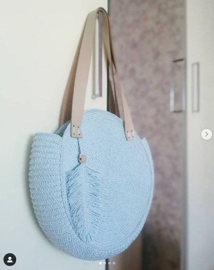 Материалы и инструменты: рафия в пасме (2 пасмы размера М), крючок 3, пришивные кожаные ручки (длина 65 см, ширина 2см), регилин.