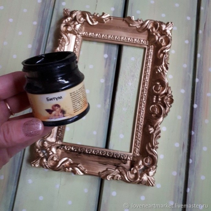 При этом способе декора натирать рамку воском или вазелином не нужно. После окрашивания, не дожидаясь полного высыхания краски, выборочно стираем краску по выпуклым частям рамки влажной салфеткой, обнажая золото. Мне второй способ нравится больше.