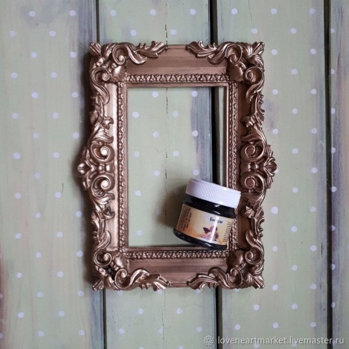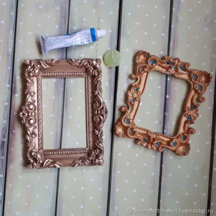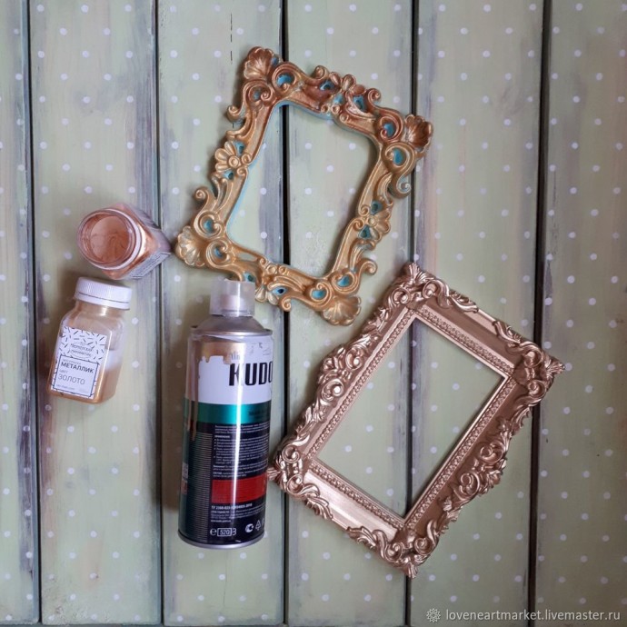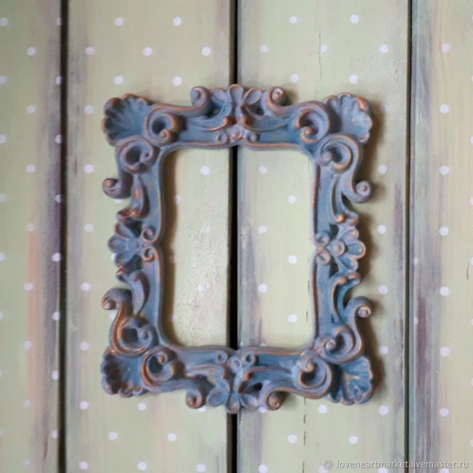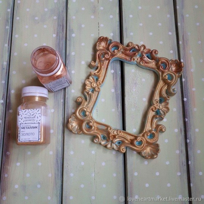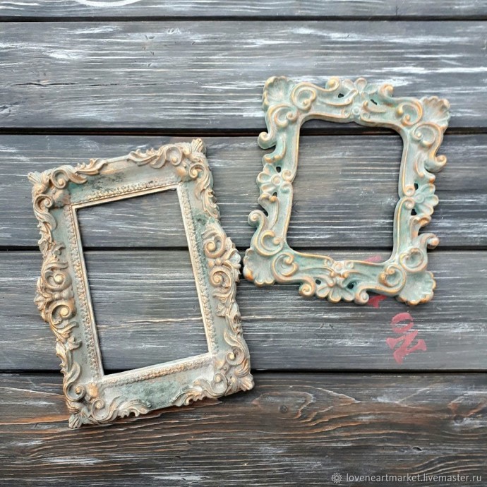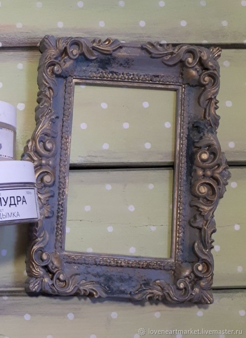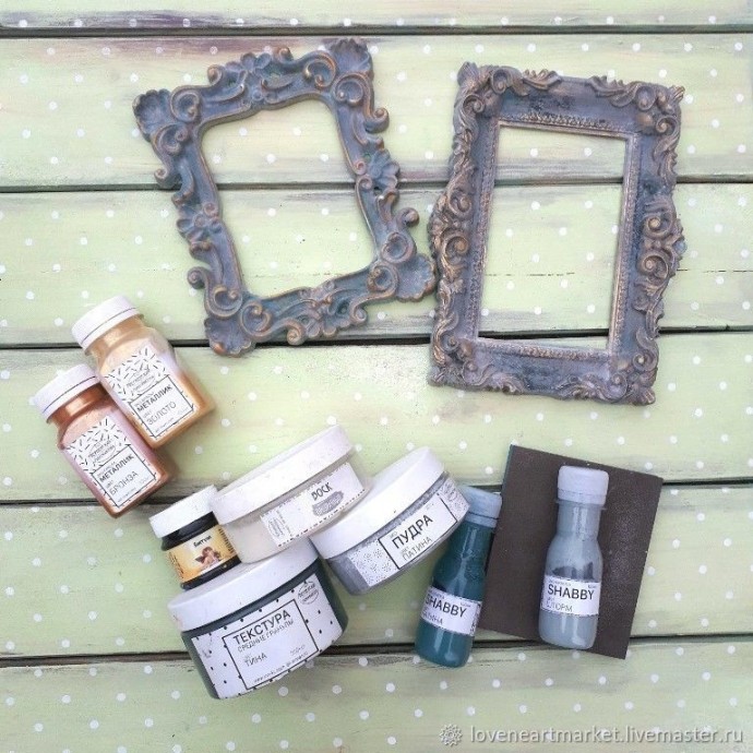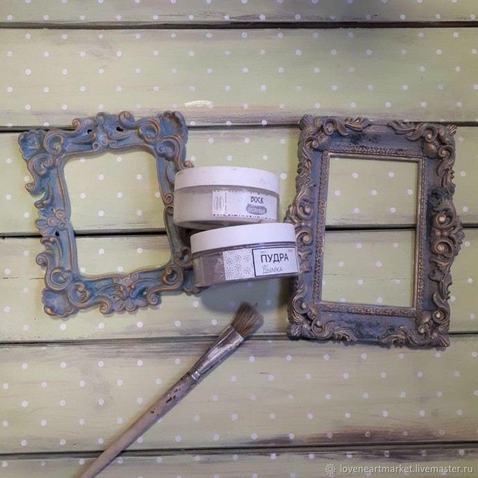 Материалы: гипсовые рамки, меловая краска, кисти, пудра, текстура, золотая краска, воск прозрачный
