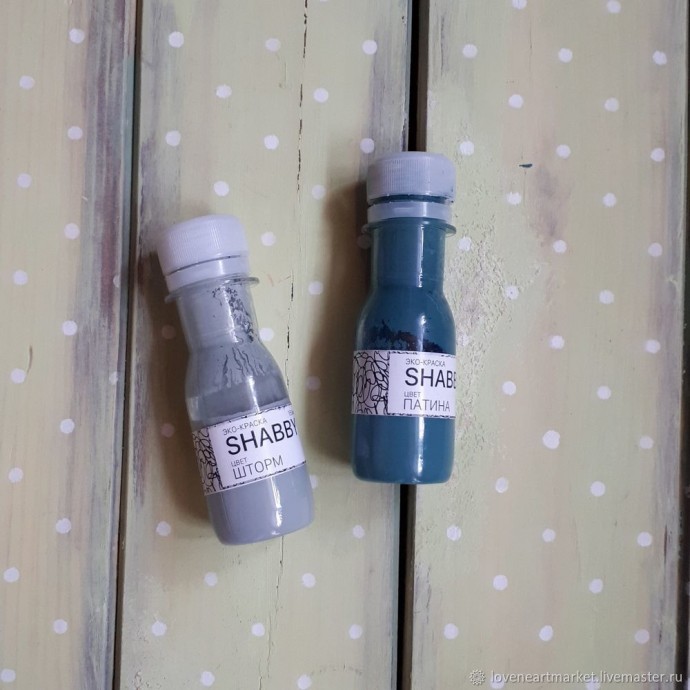 3. Краска светло-серого цвета и цвета бирюзовой патины. У меня Верненские эко-краски Shabby, цвета Шторм и Патина.