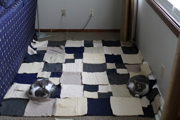 Ну конечно там где коты просто прикидывали, в каком порядке сочетать квадраты. Просто животные сразу заценили качество пледа и улеглись. Идея классная. Можно квадраты и встык сшить, тогда и не нужна будет подкладка, но с подкладкой будет лучше держать форму. Беру на заметку, мне нравится.