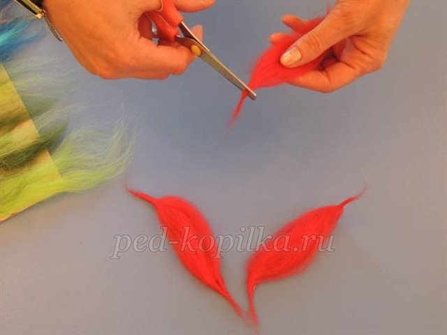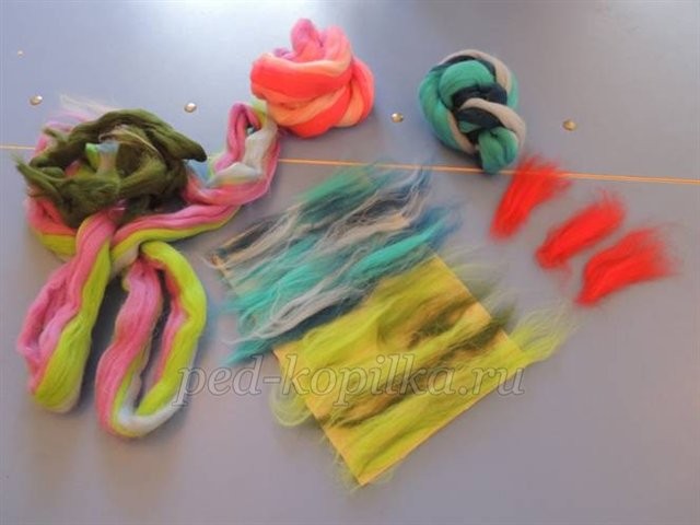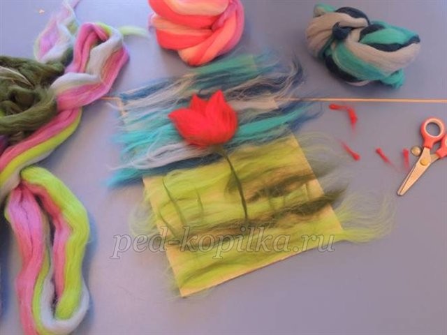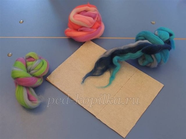 Шаг 4. Отрывая от ленты шерсти тонкие пряди, выкладываем их на фон.