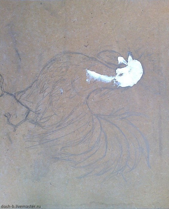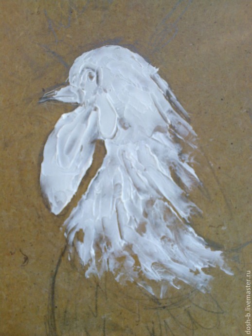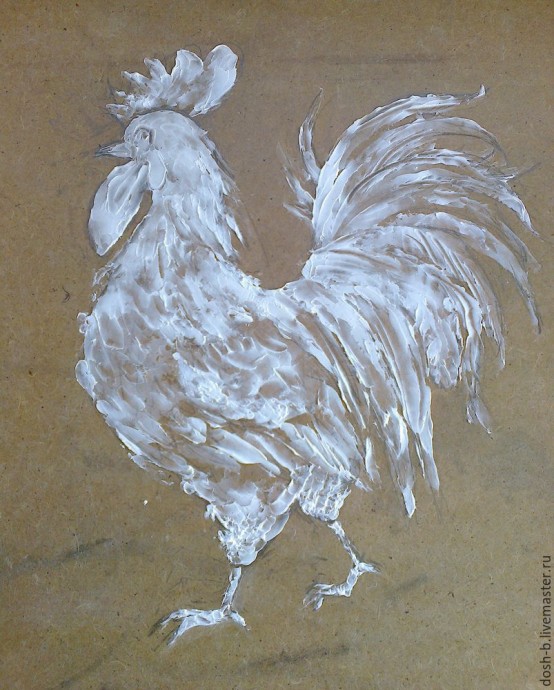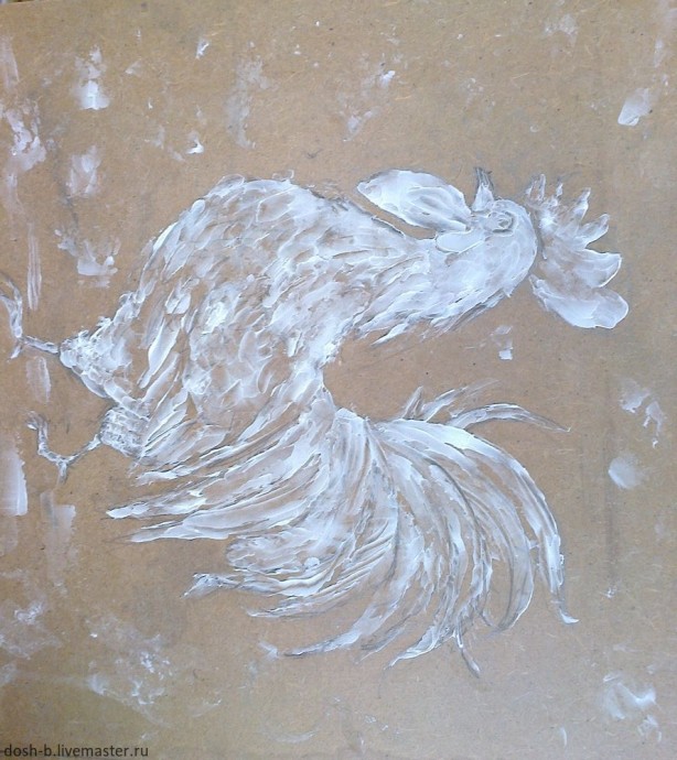 Нарисовала петушка простым карандашом. Загрунтовала оргалит акриловой строительной грунтовкой в 2 слоя, с просушкой между ними и после, минут на 30 минут.