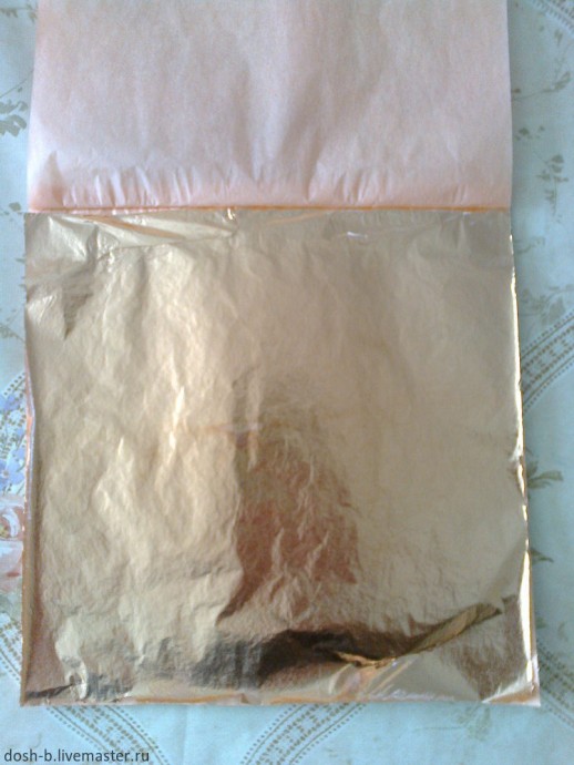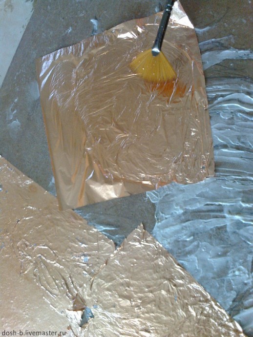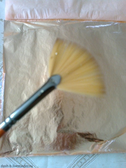 Беру бронзовую и золотую поталь в листочках, кисточку для потали и начинаю приклеевать.