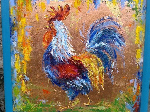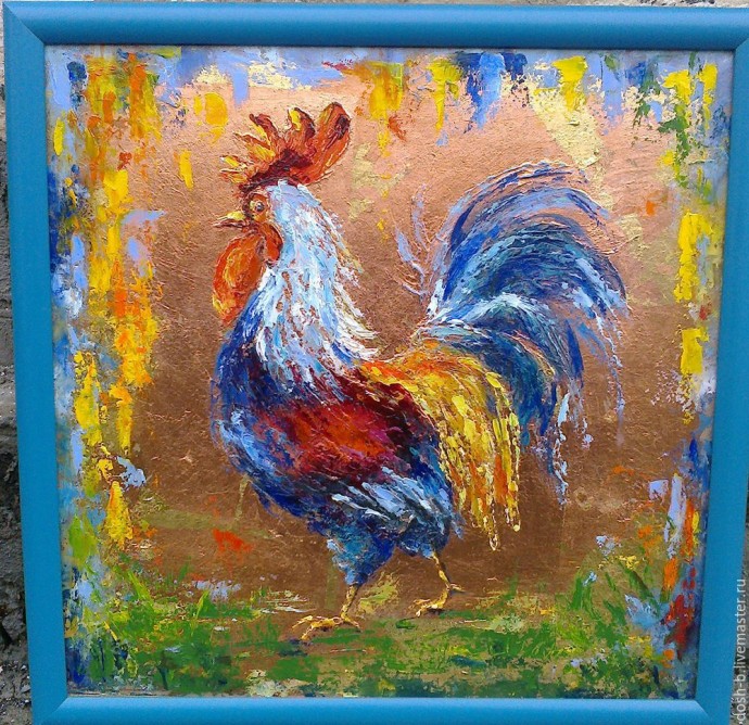 На этом рисунок закончен, оставляем сохнуть, где нибудь у источника тепла, например батареии, я положила на газовый котел. Петушок сох примерно 5 дней, когда высох, покрыла домарным лаком, оставила на ночь, он сохнет быстро. На следующий день унесла в багетную мастерскую, подобрала багет в тон картины.