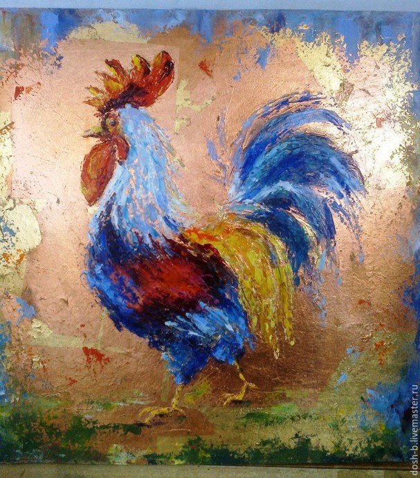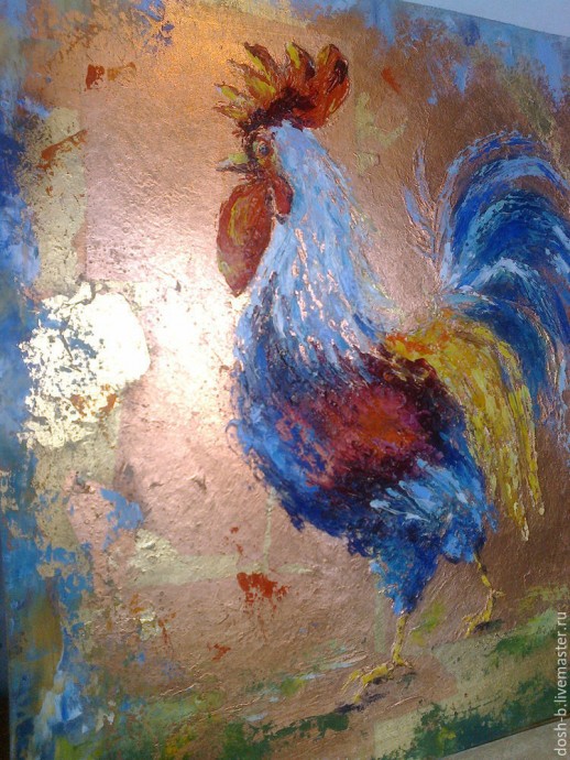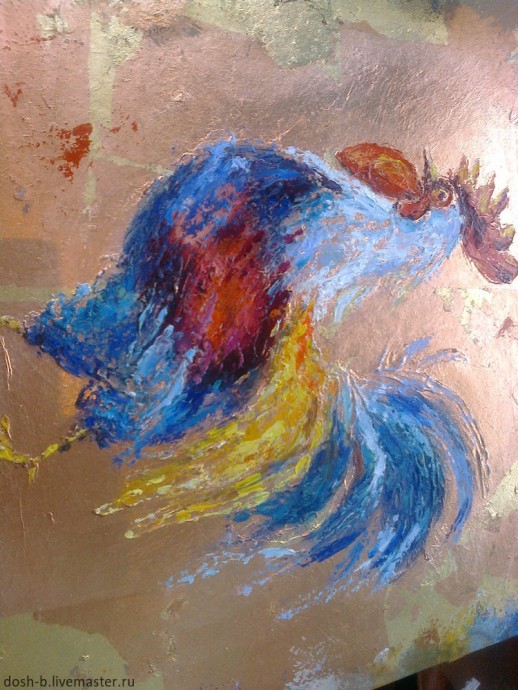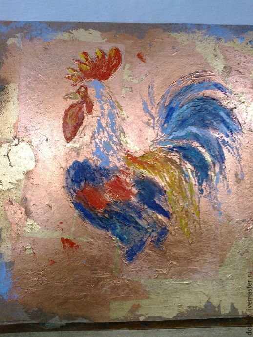 В первую очередь наносим мастихином темные цвета, немного растирая пальцем, но не нужно закрашивать всего петушка, между мазками должны оставаться пробелы, чтобы в них была видна поталь. Это создает эффект, как будто краска отпала.