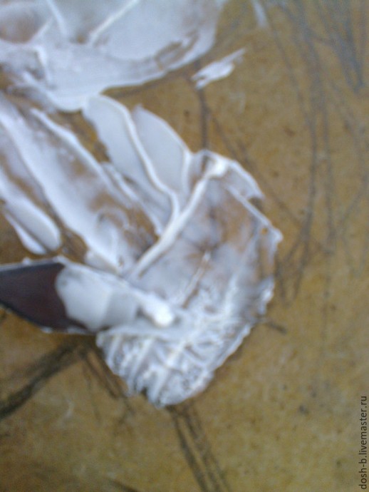Мастихин держим концом вверх, слегка придавливаем и ведем в нужном направлении, мазок не разглаживаем, но оставляем рельефным, он получается как бы с каемочкой.