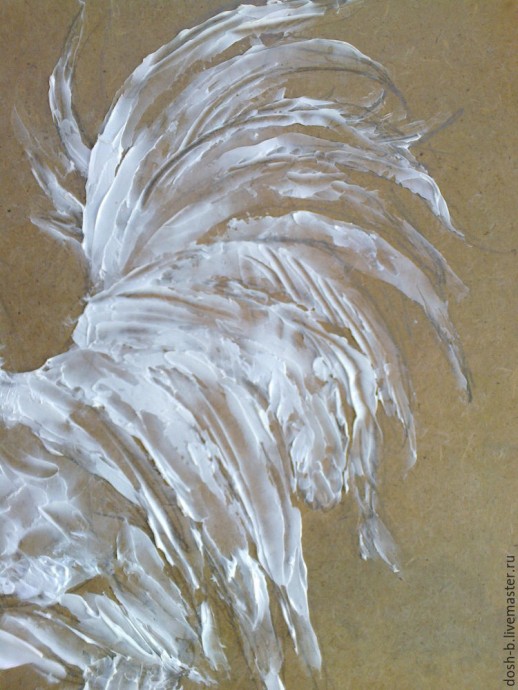Для перьев на хвосте, берем чуть больше пасты на мастихин рисуем удлиненными мазками, потом держим мастихин под углом 45 градусов и делаем как бы прорези на некоторых перышках.