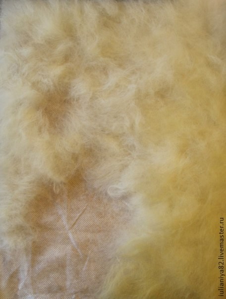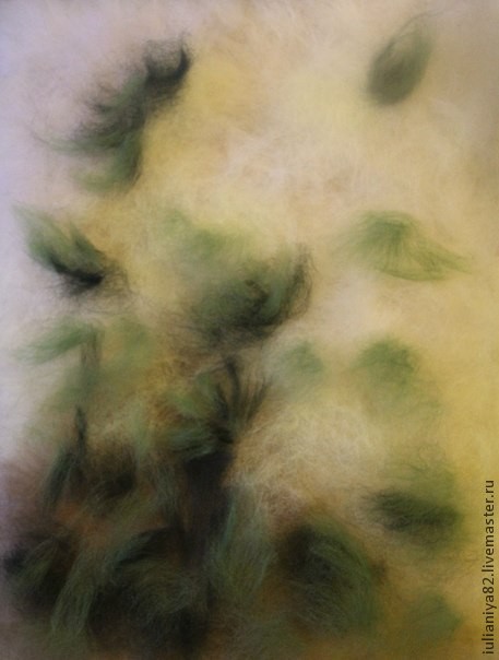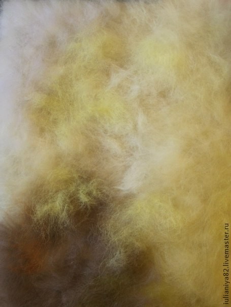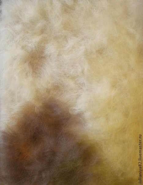 Раскладку шерсти я начинаю с основного цвета — это белый ванильный или светлая охра (высветленная). Потом дополняю другими оттенками из светлых тонов (белый, светло голубой, светло сиреневый). В нижние уголоки добавляю тёмные оттенки жёлто-зелёного (оливковый) и оттенки коричневого.