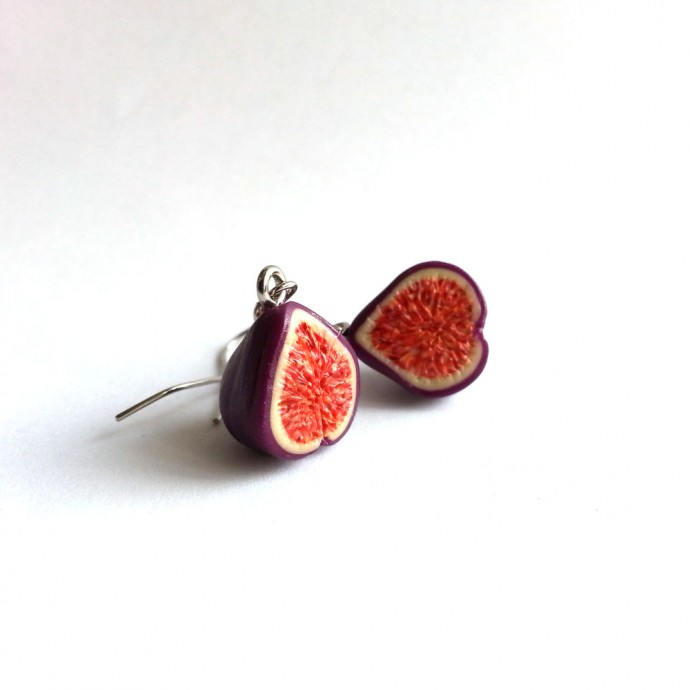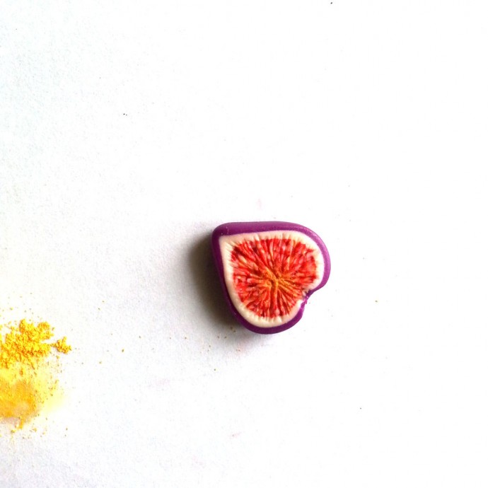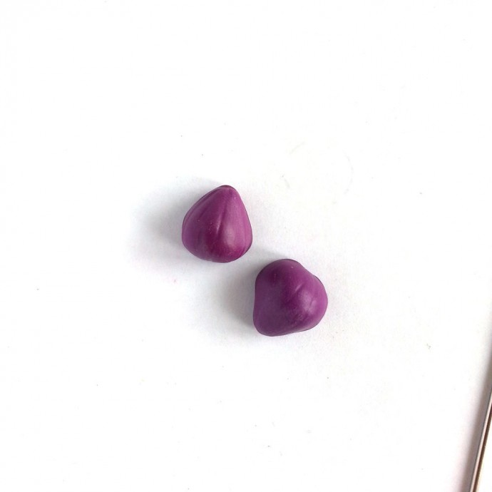 Делаем зубочисткой бороздку посередине сплющенных заготовок и вкладываем в полученную бороздку оранжевый жгутик. Это буду зернышки в мякоти инжира.