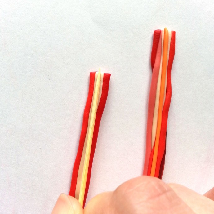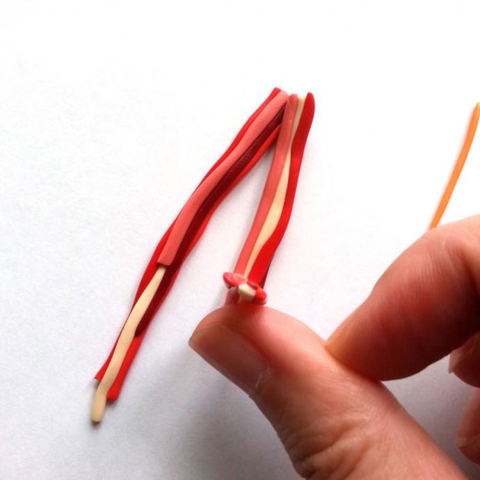 Складываем вместе подготовленные жгутики, кроме оранжевого. Можно их слегка перекрутить между собой.