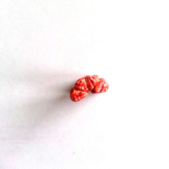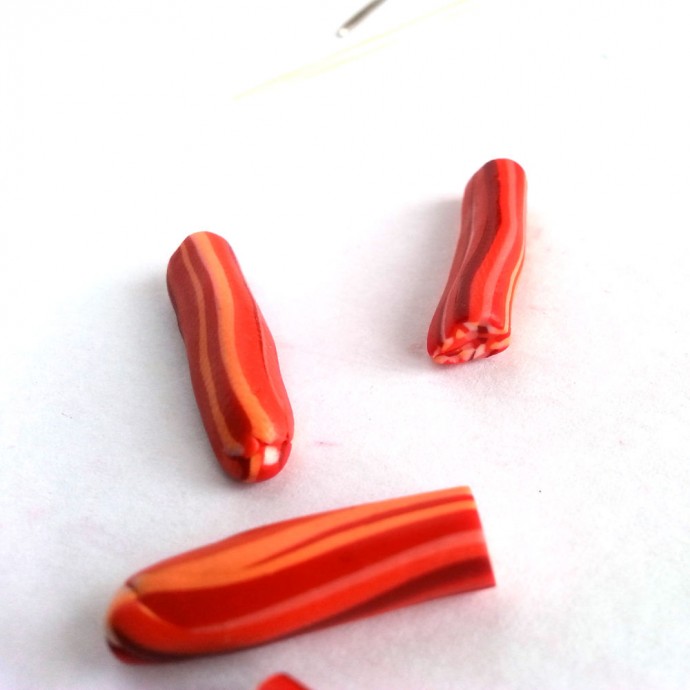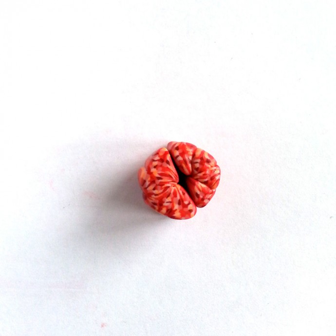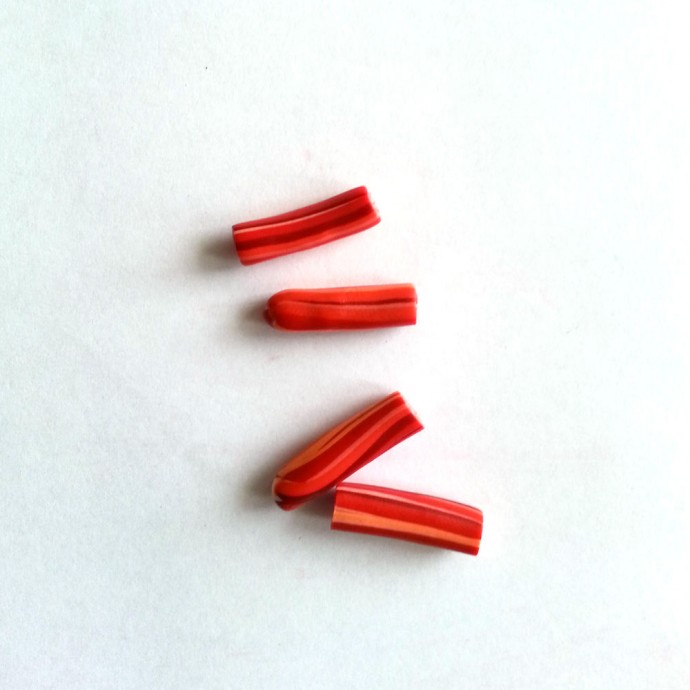Разрезаем полученную трость на 4 части. Легкая небрежность на этом этапе допускается. Это придаст дополнительную реалистичность мякоти, если рисунок не будет абсолютно симметричным.