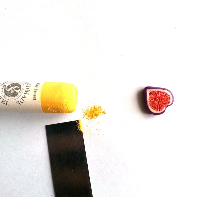 Затонируем ее при помощи сухой пастели. Берем желтую пастель и натираем ее в пыль при помощи лезвия.