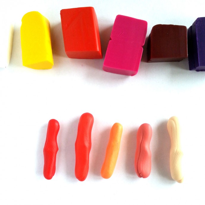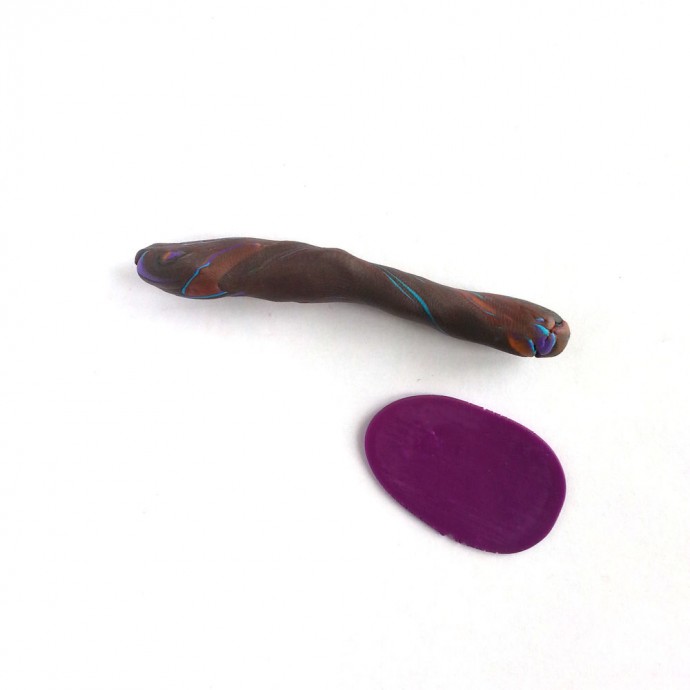 Раскатываем вручную в колбаски подготовленные таким образом цвета и бордовую глину.