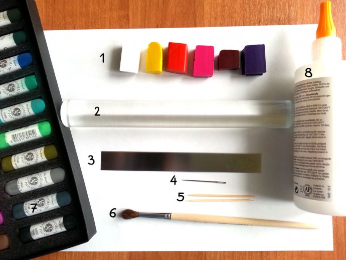 Материалы: полимерная глина, скалка, лезвие, кисть, сухая пастель, лак