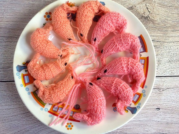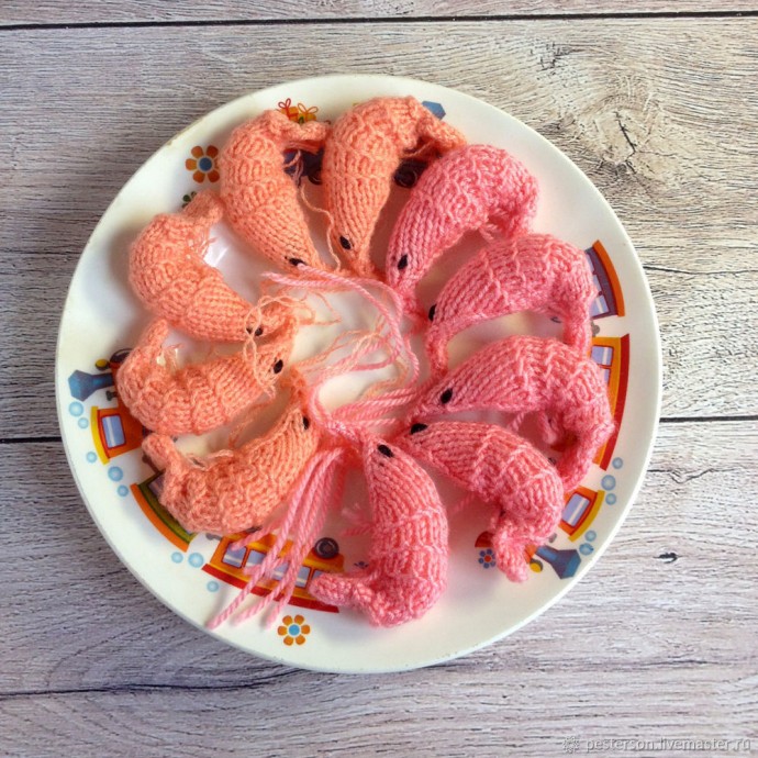Вот никогда не понимала, зачем все эти вязаные яблоки, огурцы, помидоры, и, тем более, креветки на блюде. Это с голодухи, что ли?