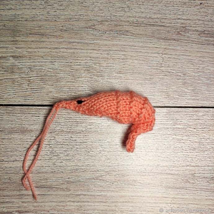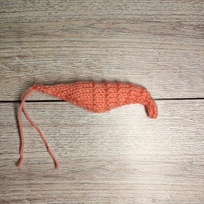 Затем, сложить пополам креветку и сшить. В процессе сшивания наполнить синтепоном.