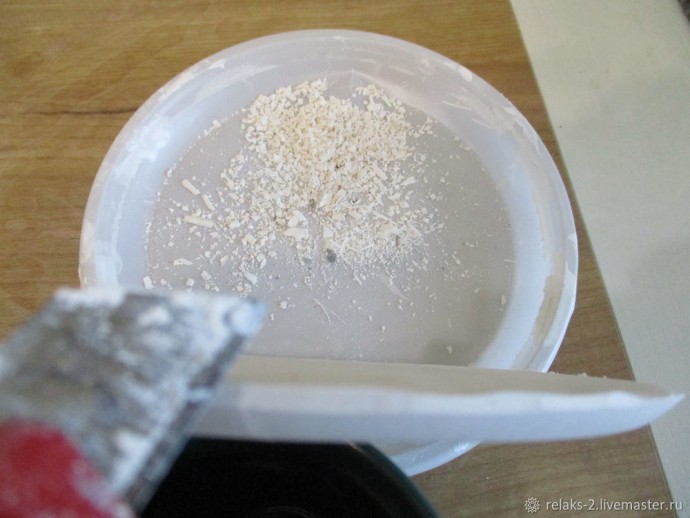 Можно алебастровую основу для подставки сделать самостоятельно. Для этого порошок алебастра по инструкции растворяем в воде и заливаем в обыкновенную пластиковую одноразовую тарелку на 1/3 глубины. Через 3 часа-основу можно вынимать. Через сутки ее края надо обрезать, сделав фаску и после просушки использовать