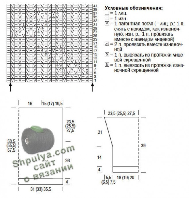 Патентный узор. Количество петель кратно 22 + 1 п. Вязать по схеме. На ней приведены только лицевые ряды; в изнаночных рядах все петли вязать по рисунку или так, как указано в «Условных обозначениях». Раппорт между стрелками постоянно повторять и закончить петлей после левой стрелки. 1-42-й р. выполнить 1 раз, затем постоянно повторять 3-42-й р.