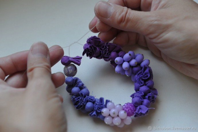 7. Расправляем бусины и завязываем концы резинки узлом.