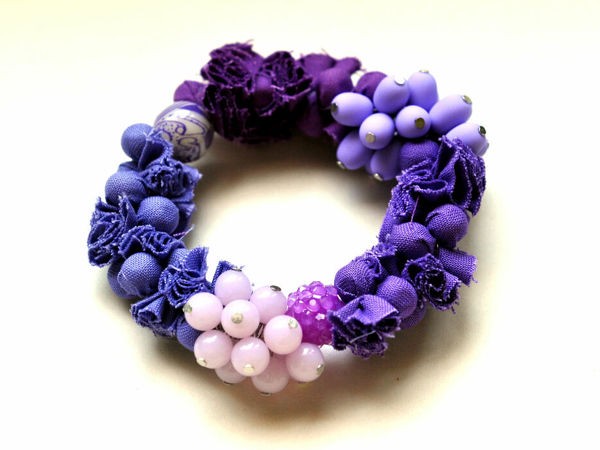 Очень эффектный необычный браслетик на резинке с использованием разнообразных бусин и ткани. Ткань и бусины могут быть одного цвета, а можно сделать яркий пёстрый микс.