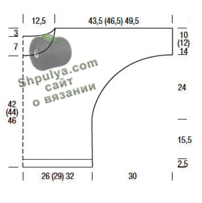 Для цельнокроеных рукавов через 15,5 см = 44 р. от планки с обеих сторон прибавить с обеих сторон 1 раз по 1 п., затем 10 раз в каждом 4-м р. по 1 п., 12 раз в каждом 2-м р. по 2 п. и в следующем 2-м р. дополнительно набрать 1 раз по 26 п. = 229 (241) 253 п.