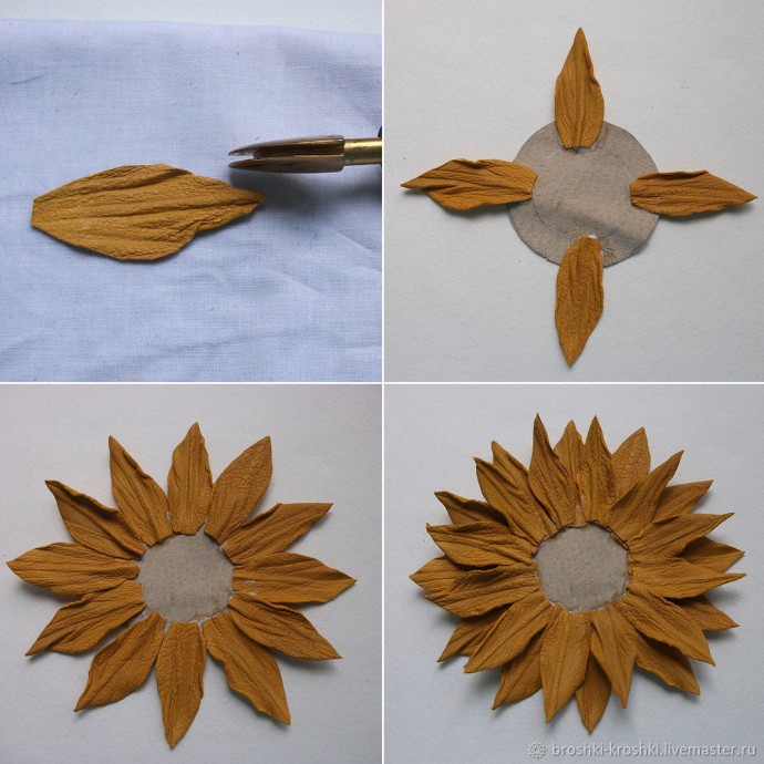 6-7. Из тонкой кожи вырежьте круг диаметром 6 см, в центре которого нарисуйте кружок диаметром 3 см — площадку для махровой серединки. По краю приклейте лепестки 1-го ряда: сначала 4 — друг против друга, а затем — по 2 лепестка между приклеенными.