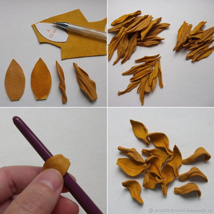 1. Из жёлтой кожи вырежьте по 12 лепестков для каждого ряда цветка (шаблоны даны в натуральную величину). Каждый лепесток хорошо смажьте с изнаночной стороны раствором клея ПВА, сложите пополам и скрутите.