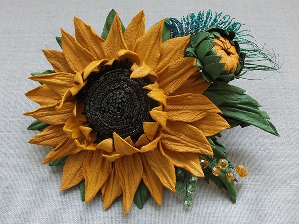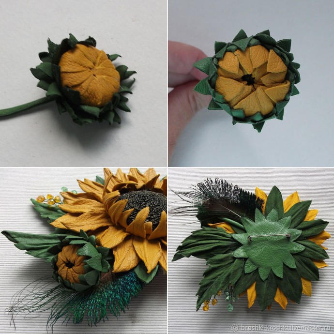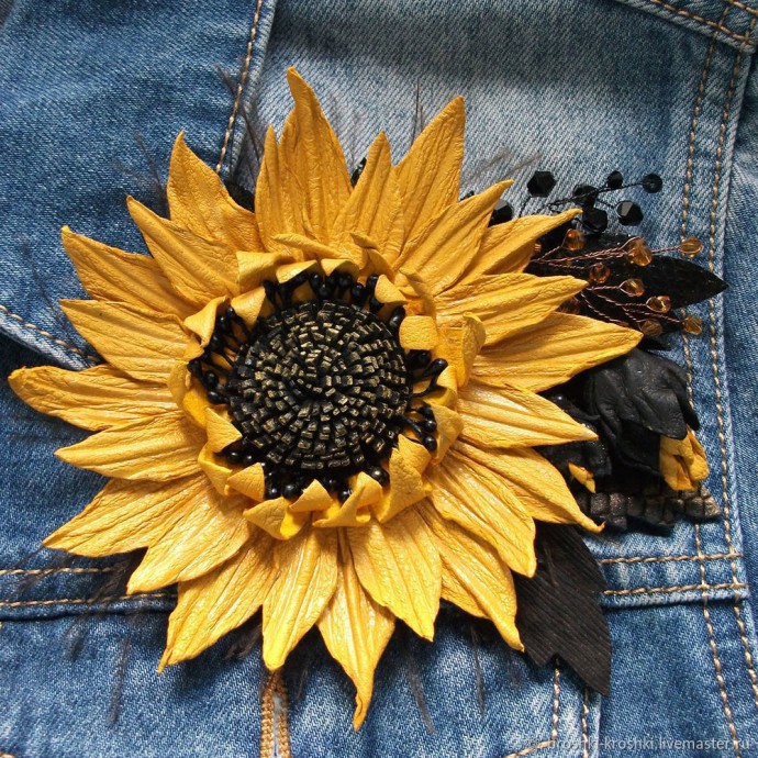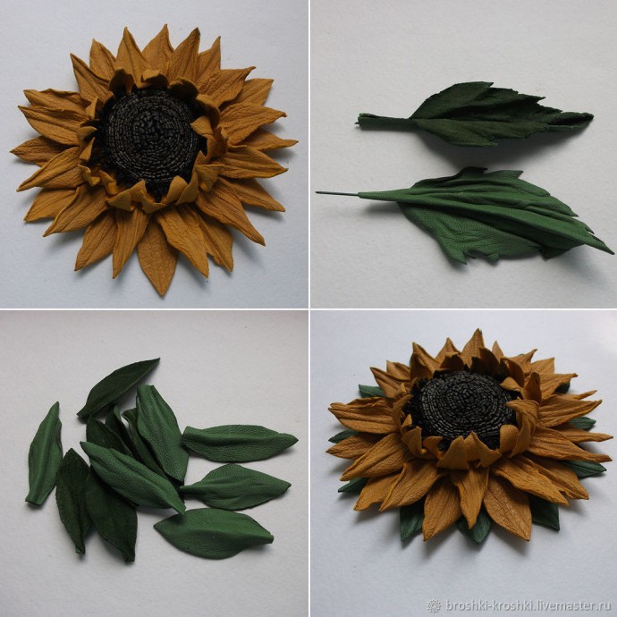 10. После этого приклейте оставшиеся маленькие лепестки и хорошо прижмите их основание, чтобы улучшить сцепление и приподнять объём. 11. Для серединки подсолнуха отрежьте полоски чёрной кожи произвольной длины шириной 0,7-1 см, на которых нарежьте мелкую бахрому.