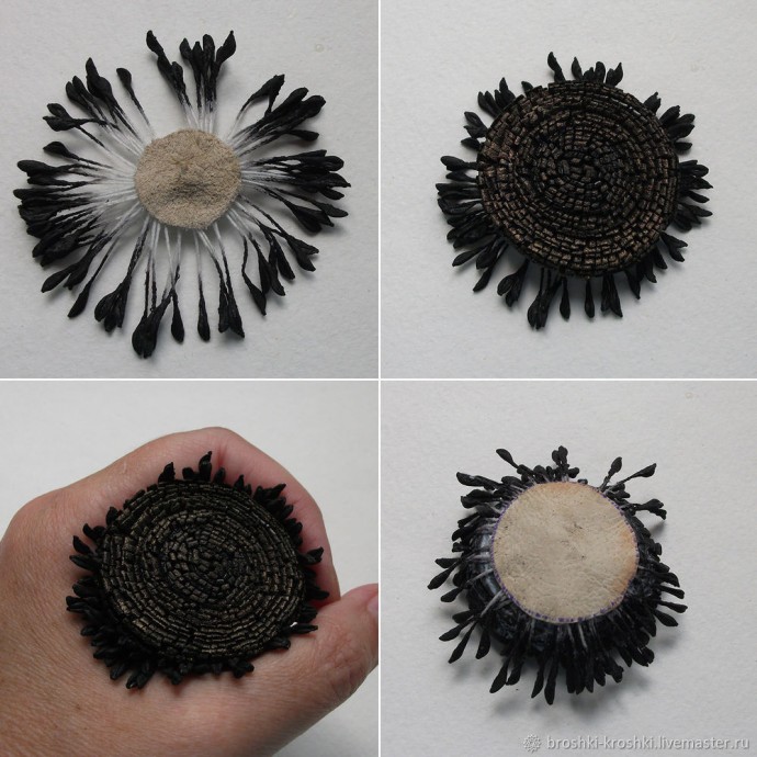 15-16. Серединку можно (но не обязательно) дополнить тычинками. Для этого толстый пучок перевяжите посередине и, расправив по кругу, зафиксируйте это положение небольшим кружочком из кожи. Тычинки приклейте снизу серединки.