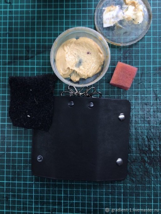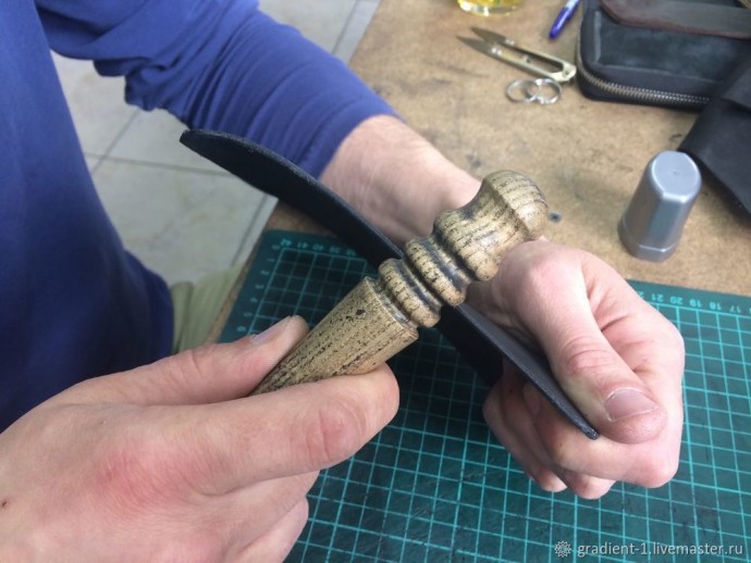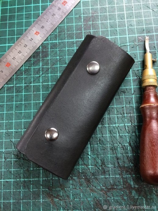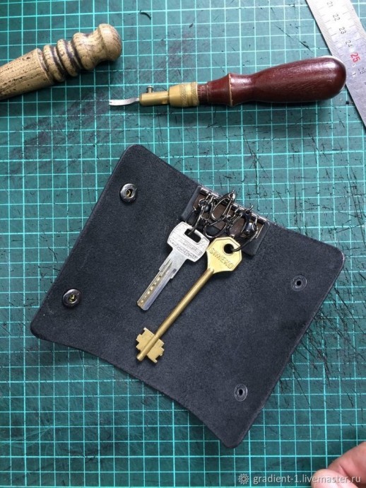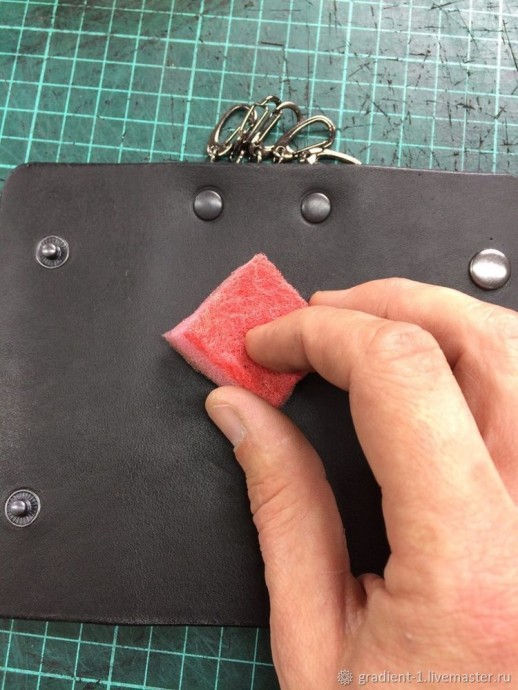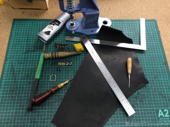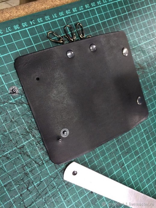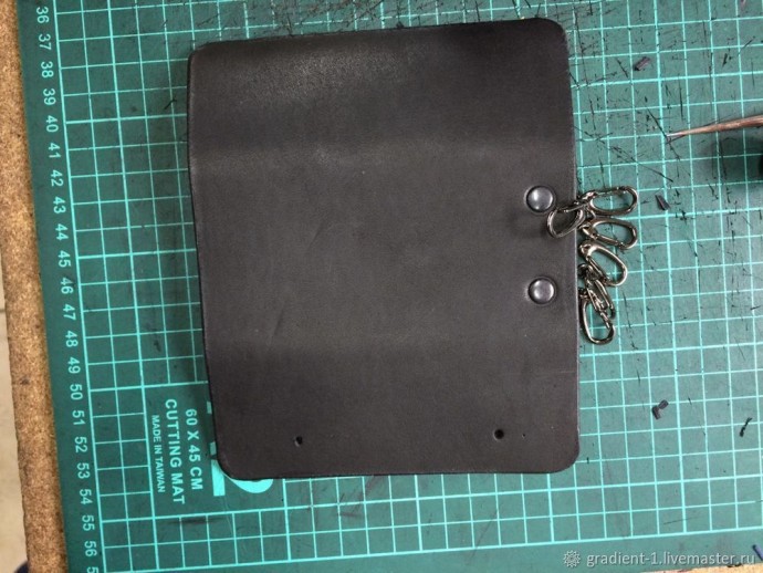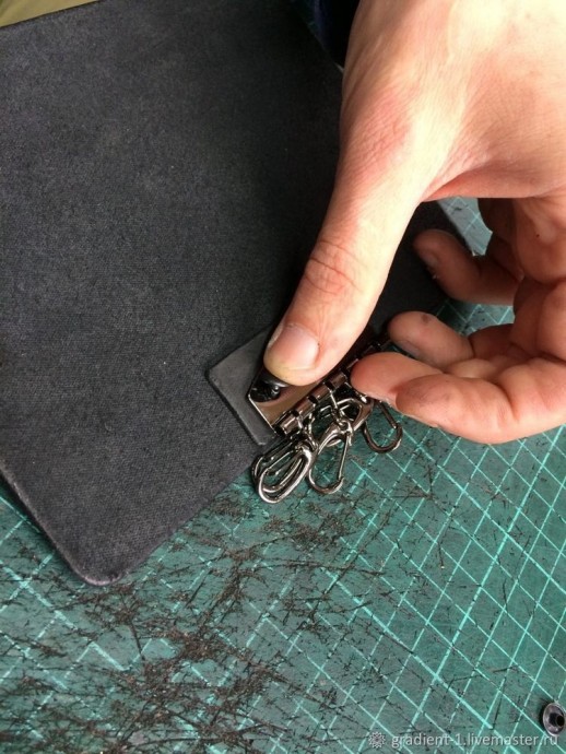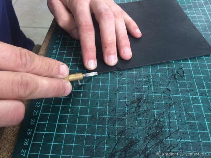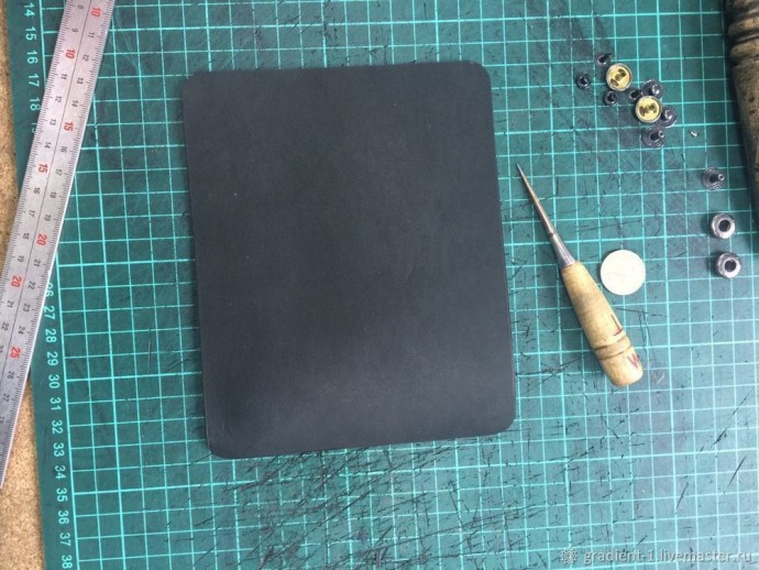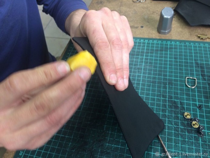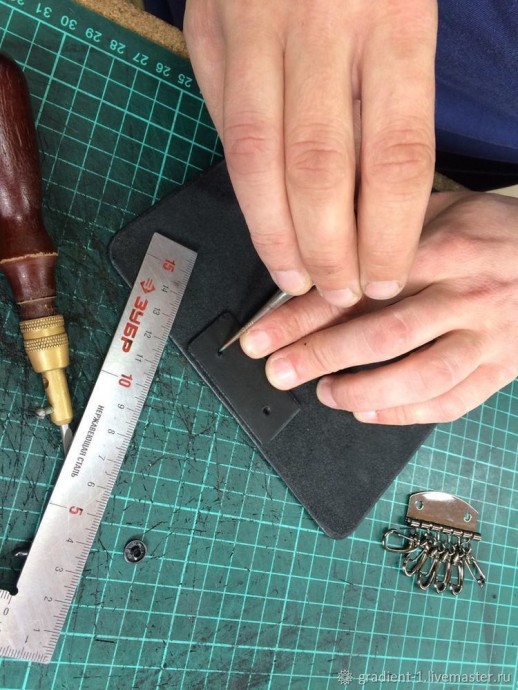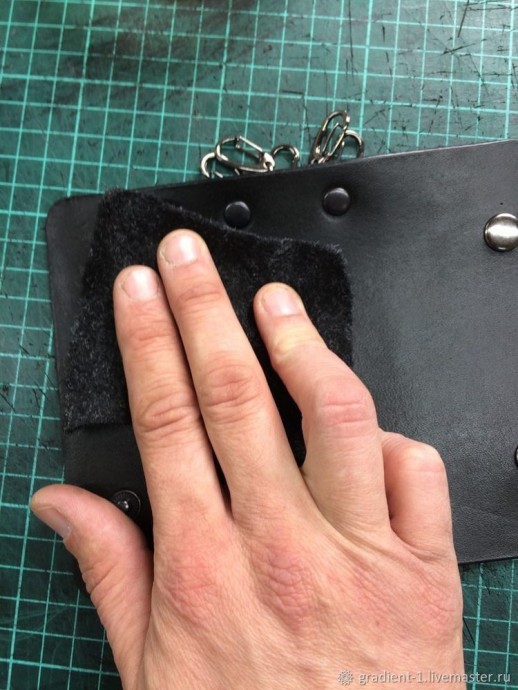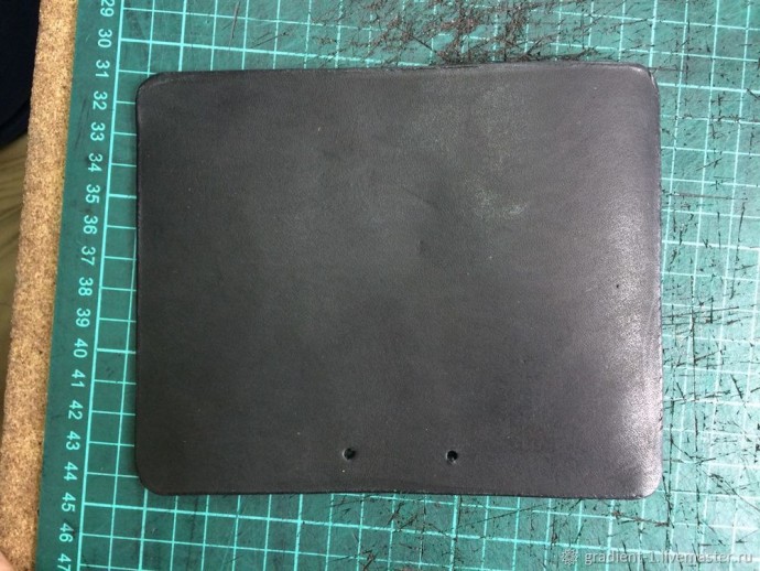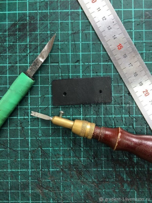 Основная деталь готова и обработана. Теперь вырежем небольшую деталь размером 25х55 мм, которая будет служить уплотнителем под карабины. На фото уже пробиты отверстия, которые мы перенесли с планки карабинов на эту деталь.