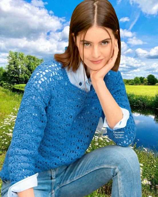 Пряжа: (100% кашемира; 88 м/25 г) — 325 (370) г синей; крючок №5.