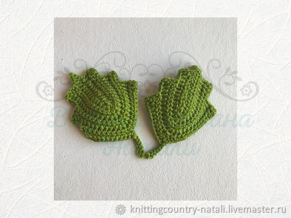 Листики (2 детали) Листики вяжем зелёной пряжей поворотными рядами с петлёй подъёма.