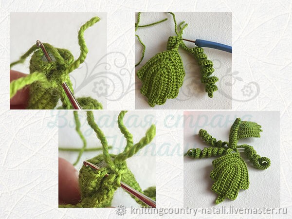 Плодоножку вяжем пряжей Камтекс Карамелька цвет 044 (трава) поворотными рядами с петлёй подъёма.