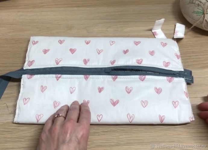 - складываю, соединяя середину молнии и рассечку на основной детали.