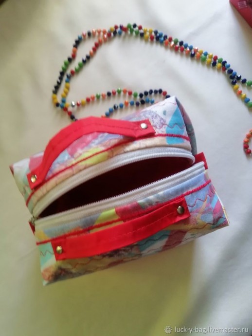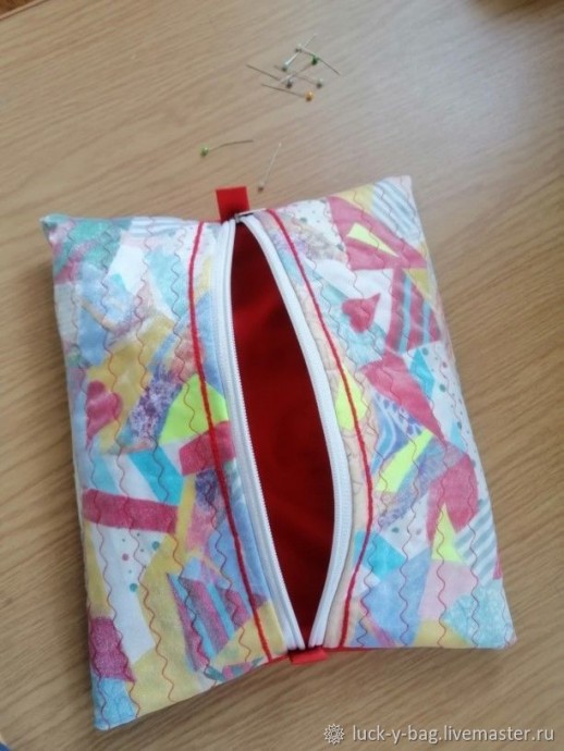 Пристрачиваем подкладочную ткань по коротким срезам, заутюживаем срезы внутрь, а затем выворачиваем так, чтобы все лицевые поверхности были внутри, а замок-молния оказалась посредине прямоугольника. Можно вставить шлевки к молнии для удобства использования.