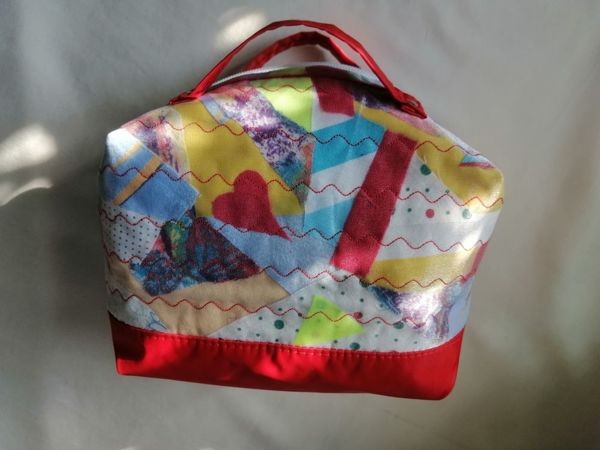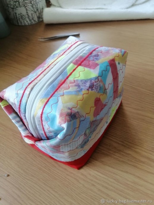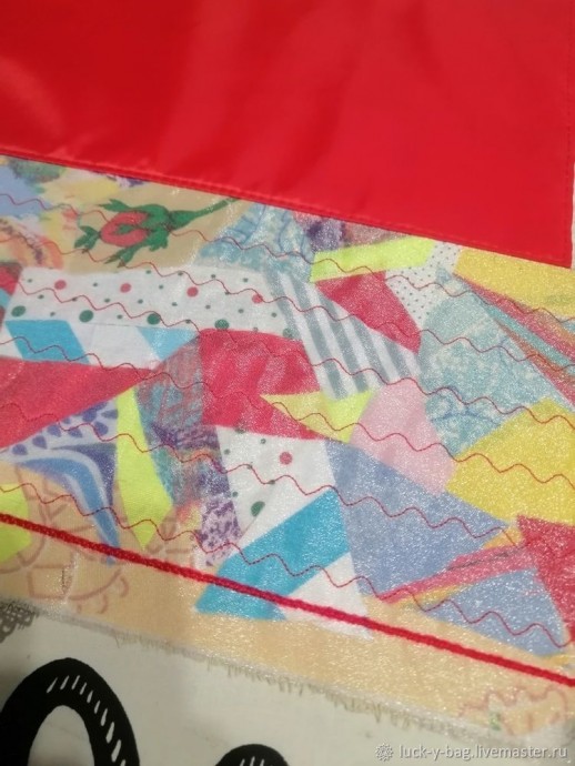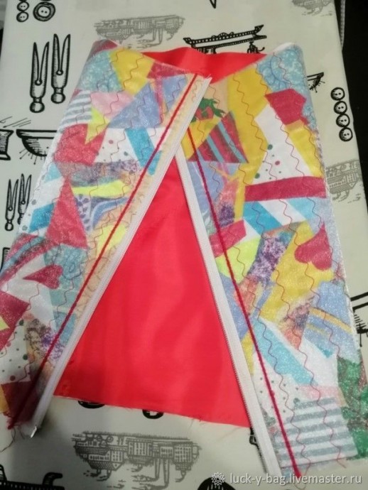 Донышко я решила сделать из плащевки для большего функционала. Поэтому готовое полотно я разрезала пополам, пришила между частями красную плащевку. По коротким срезам прямоугольника пришиваем молнию.
