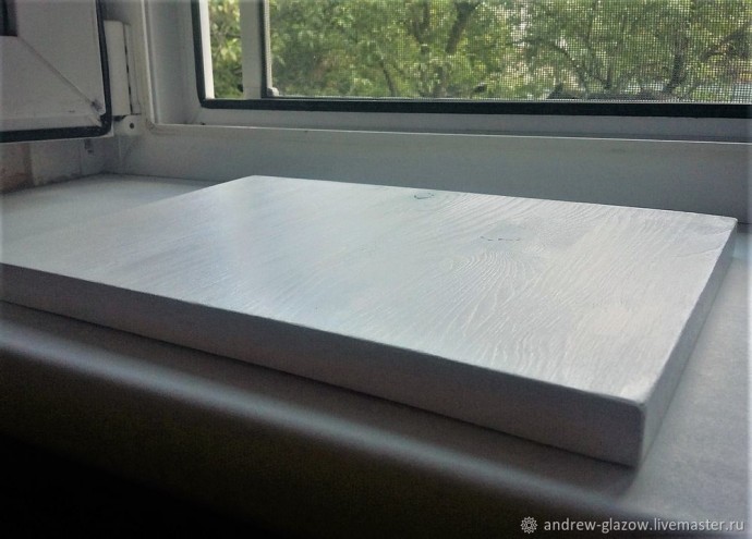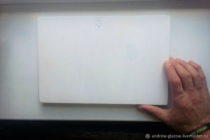 Следующим этапом была покраска основания белым акрилом. Немного жаль было закрашивать такую натуральную красоту и заднюю часть основы я все-таки оставил в первозданном виде. Краска хорошо легла на доску. Платформа превратилась в своеобразный белый холст для исполнения нашего нового опыта.