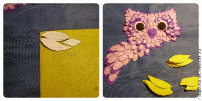На фото ниже видно, что я использовала два рисунка — один для наглядности, а другой для работы. Я вырезала детали из бумажного рисунка, и переносила их потом на фетр. Чтобы перенести рисунок совы на ткань-основу, я вырезала сову по внешнему контуру и обвела её на ткани белым карандашом. Затем вырезала первый ряд перышек из бумаги, и выкроила их из фетра в нужном количестве. Напоминаю, что это «фетродудлинг», поэтому математической точности здесь не требуется, и можно вырезать «на глаз».