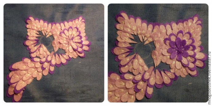 Прикладываем к ткани-основе, фиксируем английскими булавками. Затем начинаем пришивать тем же способом, что и перышки.