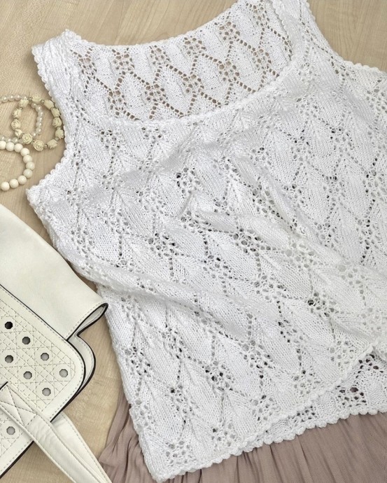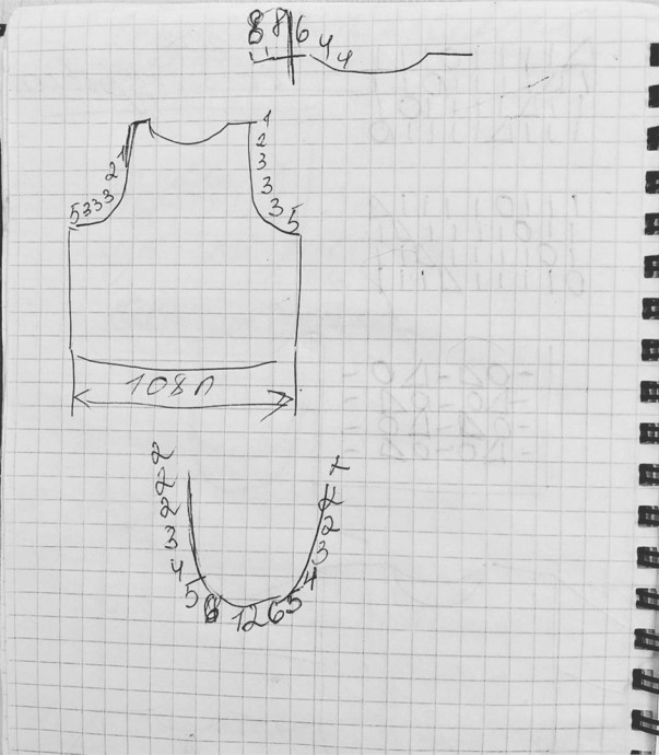 Набирала 240 петлей на 44 размер. Низ , горловину и проймы обвязывала крючком. Убавления пройм и закрытие горловины на фото. Пряжа мне понравилась, нежная, шелковистая. Вяжется хорошо. После ВТО слегка вытягивается.