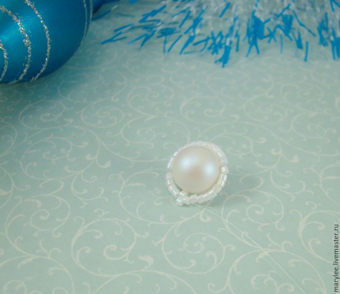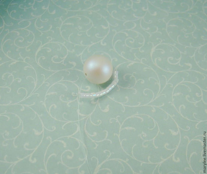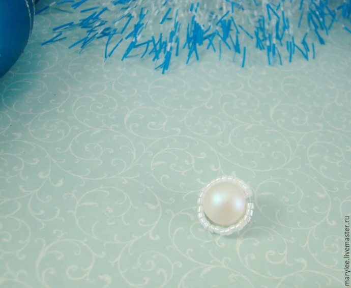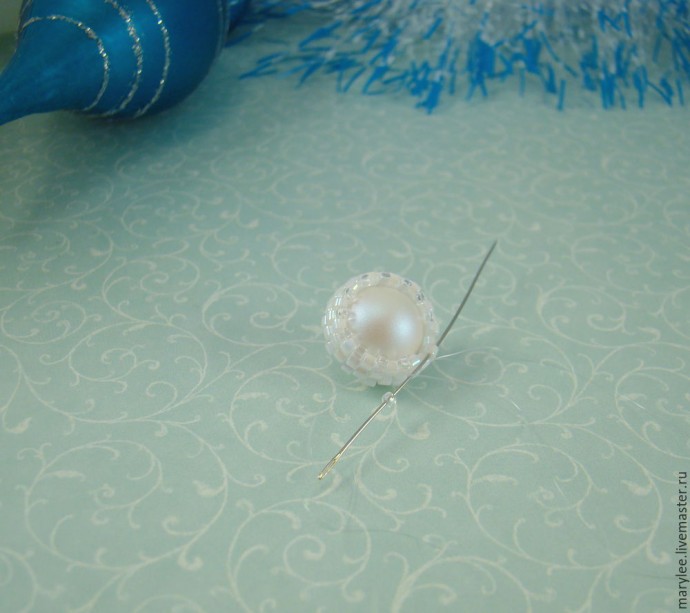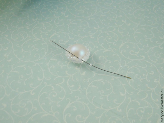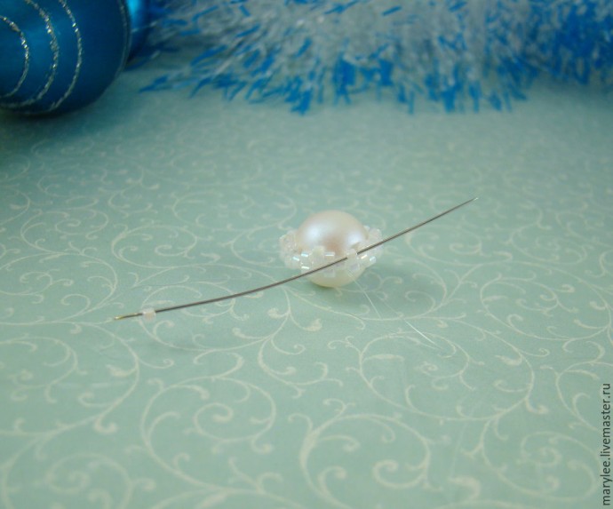 Набираем еще 13 бисерин, продеваем иглу в жемчужину, проходимся по всем бисеринам один-два раза. На жемчужине получился ободок из 26 бисерин.